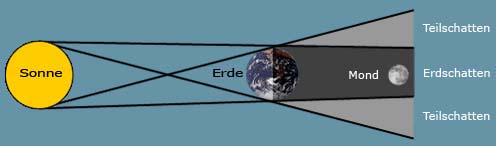 Eine totale Mondfinsternis entsteht, wenn der Mond durch den Erdschatten wandert. Das geschieht, wenn die Erde zwischen ihm und der Sonne steht. Auf ihrer sonnenabgewandten Seite wirft die Erde einen spitz auslaufenden Kernschatten. Um diesen herum liegt ein Halbschatten, der mit wachsender Entfernung von der Erde kontinuierlich breiter wird.