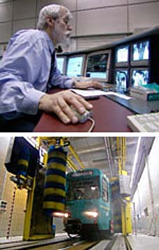 | Schlaflos in der Unterwelt: Die U-Bahn Frankfurt bei Nacht Spätschicht in der Leitstelle. Ein Ruf schreckt die Leute auf: "Person im Tunnel!". Per Mausklick wird die Strecke gesperrt und der Ordnungsdienst alarmiert. Auf dem Monitor erscheint eine Frau, bepackt mit Plastiktüten. Sie klettert aus der Röhre und verschwindet hastig über die Rolltreppe. Entwarnung. Neulich hatte ein Mann, der den Tunnel als Toilette benutzen wollte, weniger Glück. Er starb noch auf den Gleisen. Während die Leitstellencrew aufatmet, putzt Mehmet Dilele Fenster. Der 38jährige Türke und sein Kollege reinigen U- und S-Bahnen, oft 20 komplette Züge pro Nacht. Die Waschanlage ist 400 m lang. Von außen reinigen Bürsten, von innen schrubbt Mehmet. Bis vier Uhr früh. |