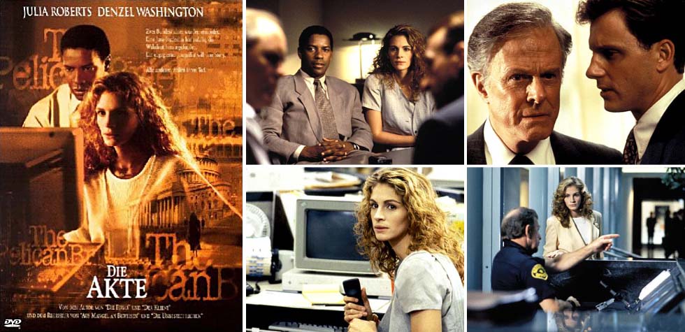 Die Akte(The Pelican Brief) An einem gewöhnlichen Abend in Washington D.C. werden der Bundesrichter Rosenberg (Hume Cronyn) und sein jüngerer Kollege Jensen (Ralph Cosham) ermordet. In New Orleans macht der Fall Jura-Professor Thomas Callahan (Sam Shepard) und seine Freundin Darby Shaw (Julia Roberts) sehr neugierig. Darby recherchiert und sammelt ihre erstaunlichen Theorien in der "Pelikan-Akte". Thomas ist von Darbys Recherche-Ergebnissen fasziniert und besteht darauf, die Akte an das FBI weiter zu leiten. Doch kurz nachdem er sie an FBI-Anwalt Gavin Verheek (John Heard) weiter gereicht hat, wird Thomas mit einer Autobombe in die Luft gesprengt. Entsetzt muss Darby feststellen, dass ihre Spekulationen der Wahrheit offensichtlich gefährlich nahe kommen, so dass auch ihr Leben in akuter Gefahr sein dürfte. Da sie mutterseelenallein gegen die unbekannten Killer keine Chance hat, wendet sich die verängstigte Darby an einen Freund des getöteten Callahan, den integren Journalisten Gray Grantham (Denzel Washington), der ihr dabei helfen soll, die Theorien der Pelikan-Akte zu beweisen und die Story an die Öffentlichkeit zu bringen, bevor die Killer Darby ausschalten können.