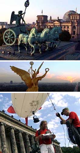 Mit dem Zeppelin über der HauptstadtBerlin aus halber Höhe Fliegen wie ein Vogel, ein alter Menschheitstraum wird wahr. Zumindest für die Kamera von Jürgen Hohmuth und Ralf Brauner. Die beiden Videofilmer und Fotografen aus dem Prenzlauer Berg haben ihre HD-Kamera an einen sieben Meter langen Zeppelin gehängt. Vom Boden aus gezogen, fliegt das mit Helium gefüllte Kamera-Luftschiff in einer Höhe von etwa vier bis 60 Metern über Berlin. Anders als alle früheren Luftbildfotografen fotografieren und filmen Hohmuth und Brauner die Stadt gewissermaßen aus halber Höhe. So entstehen nie gesehene, brillante Aufnahmen in der neuen HD-Technik. Die Film-Autoren entdecken zusammen mit dem Historiker Christoph Stölzl, dem Vizepräsidenten des Bundestages Wolfgang Thierse und der Berliner Schauspielerin Dana Golombek die Stadt neu. Auf dem gemeinsamen Spaziergang fliegen sie Auge in Auge mit der "Goldelse" über den Wipfeln des Tiergartens, schauen in den hohlen Zahn der Kaiser-Wilhelm-Gedächtnis-Kirche und erleben die scheinbar schwebenden Figuren unter der Dachkante des Reichstages.