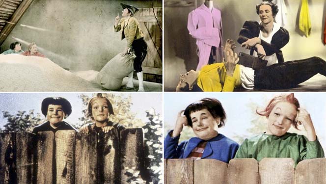Die nimmermüden Lausbuben Max und Moritz haben nichts als Streiche im Sinn. Für den Anfang bringen sie die Hühner der Witwe Bolte zu Tode und stehlen ihr hinterher die Brathähnchen aus der Pfanne. Den Schneidermeister Böck locken sie auf einen Steg, den sie zuvor angesägt haben, und dem Lehrer Lämpel füllen sie die Meerschaumpfeife mit Schießpulver. Schließlich stopfen sie Onkel Fritz die Matratze voller Maikäfer. Als die beiden beim Bäcker einsteigen, um das leckere Zuckerwerk zu naschen, fallen sie kopfüber in den Teig. Der Bäcker steckt sie in den Ofen, doch dann knabbern sich Max und Moirtz wie zwei Mäuse durchs Backwerk. Mit knapper Not entkommen, haben die beiden noch nicht genug.