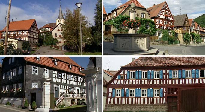 Topographie: Bayerische HauslandschaftenHaßberge Die Haßberge waren jahrzehntelange benachteiligtes Zonenrandgebiet im nördlichen Unterfranken. Was die alte Baukultur angeht, liegt hier so etwas wie ein letztes Bauernhaus-Paradies in Bayern. Der große Tornado der Abrißwut ist an den Haßbergen gnädig vorbeigegangen. Nirgends mehr in Bayern gibt es so viele schöne Dörfer, so dicht zusammen wie hier. Nach den Zerstörungen des Dreißigjährigen Krieges hat sich hier der Fachwerkbau zu einer ungewöhnlichen gestalterischen Qualität gesteigert. Die Haßberge waren jahrzehntelange benachteiligtes Zonenrandgebiet im nördlichen Unterfranken. Was die alte Baukultur angeht, liegt hier so etwas wie ein letztes Bauernhaus-Paradies in Bayern. Der große Tornado der Abrißwut ist an den Haßbergen gnädig vorbeigegangen. Nirgends mehr in Bayern gibt es so viele schöne Dörfer, so dicht zusammen wie hier. Nach den Zerstörungen des Dreißigjährigen Krieges hat sich hier der Fachwerkbau zu einer ungewöhnlichen gestalterischen Qualität gesteigert.