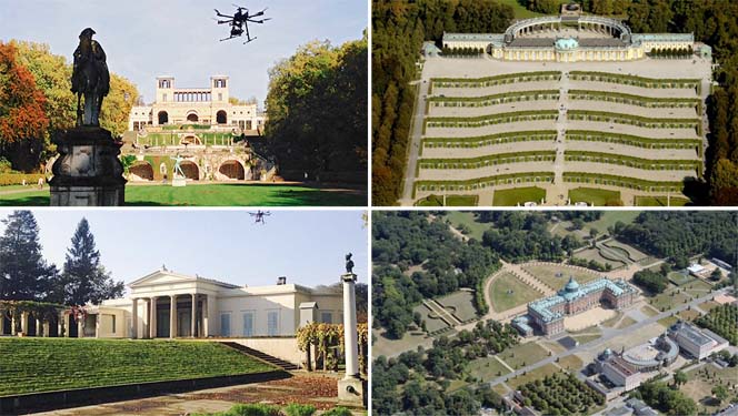 Brillante Eindrücke von den vertrauten historischen Orten im Schlosspark, aufgenommen mit einer fliegenden Kamera: Hartmut Dorgerloh, Generaldirektor der Stiftung Preußische Schlösser und Gärten, begrüßt am Grünen Gitter zu einem ganz besonderen Ausflug. Vom terrassierten Weinberg, über das Lustschloss und das Neue Palais aus der Zeit Friedrich des Großen bis hin zu Orangerie und Schloss Charlottenhof von Friedrichs Nachfahren. Mit den neuen Fluggeräten eröffnet sich die Sicht auf Formen und Strukturen des Parks, die Blumenpracht der Gärten und beeindruckende Nahaufnahmen von Fontänen, Sichtachsen und Kuppeln. Dabei schwebt der Oktokopter manchmal haarscharf an Turmspitzen und Springbrunnen vorbei, gleitet senkrecht an Fassaden und Statuen empor oder rast im Nu durch das Dickicht des Rehgartens.