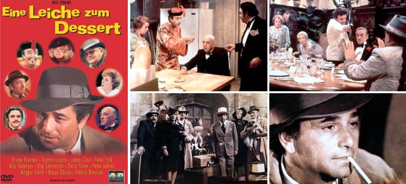 ![]() Der exzentrische Millionär Lionel Twain (Truman Capote) hat die fünf bedeutendsten Detektive der Welt zum Dinner gebeten und kündigt ihnen eine Leiche zum Dessert an.Sidney Wang (Peter Sellers), Milo Perrier (James Coco), Sam Diamond (Peter Falk), Dick Charleston (David Niven) und Jessie Marbles (Elsa Lanchester) erwarten ein turbulentes Wochenende. Und tatsächlich: Schon auf dem Weg ins gottverlassene Schloß sorgen wacklige Brücken, dichte Nebel und herabstürzende Statuen für Nervenkitzel. Für die brennenden Betten, versteckten Bomben, Giftschlangen oder das fehlende Menü kann zunächst niemand verantwortlich gemacht werden. Schließlich ist der Butler (Alec Guinness) blind und die Aushilfsköchin (Nancy Walker) taubstummä Drollig! Drehbuchautor Neil Simons Detektive sind allesamt Persiflagen berühmter Vorbilder: Peter Falk erinnert an Sam Spade, James Coco an Hercule Poirot, Elsa Lanchester an Miss Marple, Peter Sellers an Charlie Chan und David Niven an Nick Charles. |